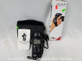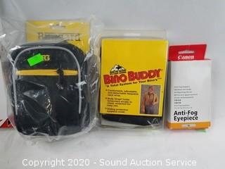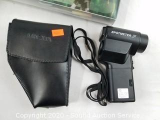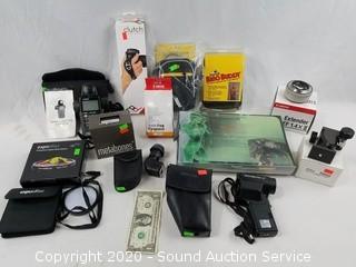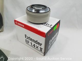 Lot Details: Includes Sekonic Dual Master L-558R light meter, element cover, digital white balance exposure disc, camera bag, camera hand strap, anti fog eye piece, Bino Buddy, Canon Angle Finder C, Minolta Spot Meter F, Slow Motion adapter for iPod, Canon extender EF1.4XII and Metabones professional adapter ring.