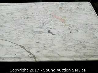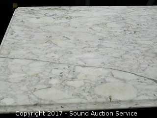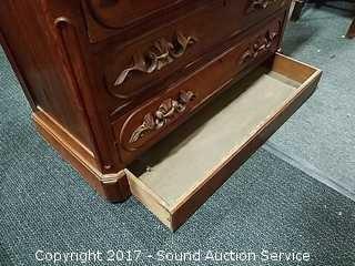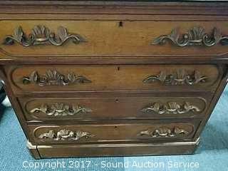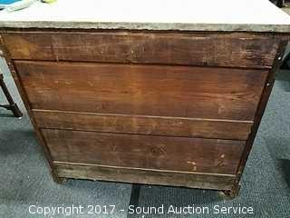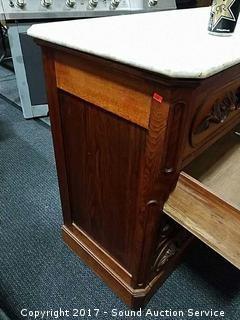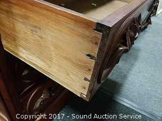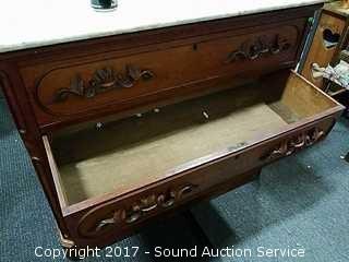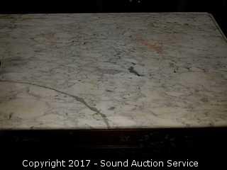 Dovetail construction. Ornately carved wooden handles. Marble has a couple dings and has been repaired. Hidden drawer in the bottom molding. Approx. 37" tall, 41.5" wide and 19.5" deep.