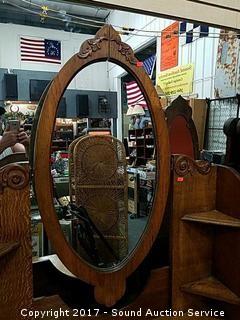 Dovetail construction. Steel castors. Center mirror has a split in the wood. One of the drawer pulls is missing the handle and nail. Approx. 72" tall, 39" wide with (2) 12" wide mirrors that fold out, and 16" deep.