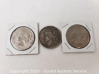 Lot #0187: (3) 90% Silver 1921, 1922 & 1925 Peace Dollars