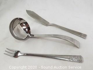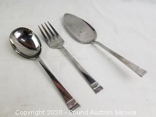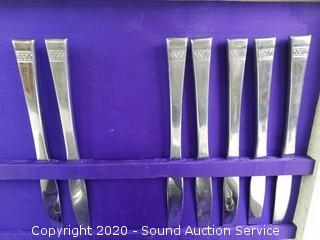 Lot Details: Includes 4 large serving spoons, 8 table spoons, 17 tea spoons, 6 stirring spoons, 7 long forks, 8 salad forks, 8 spreaders, 7 knives and 6 serving pieces.