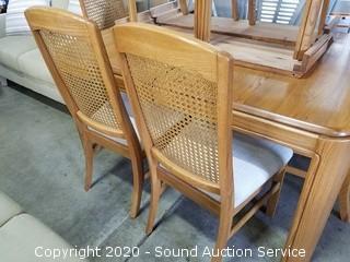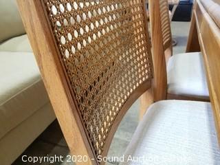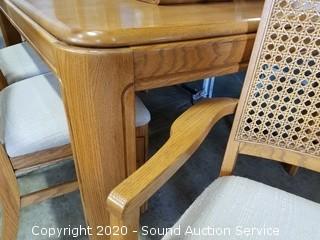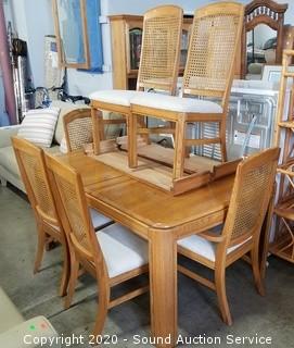 Lot Details: Mfg. in 1989. In excellent condition. 6 Cane back chairs (2 are captains) & (2) 11.5" leaves. 30" H x 60" x 42".