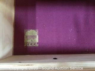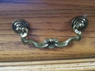 Lot Details: In excellent condition. 3 felt lined drawers, one with flatware tray. Upper cabinet doors have beveled glass, glass shelf with plate grooves. 2 piece for easier travel. 77" H x 55" W x 17" D.