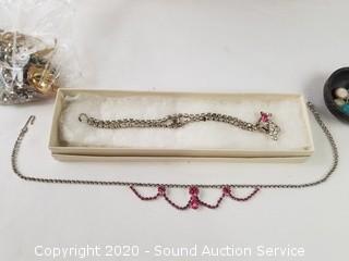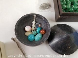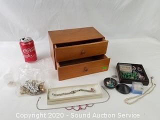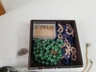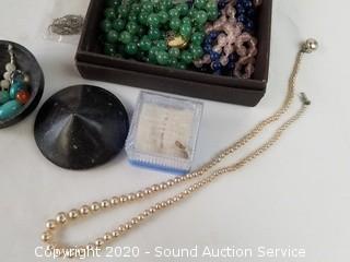 Lot Details: Some gemstones, stone beaded necklaces (lapis, jade), rhinestones, necklaces, earrings and more. Comes with a 2-drawer dovetail construction wood box, 5.5" x 10" x 6".