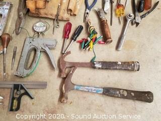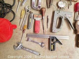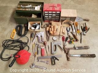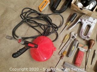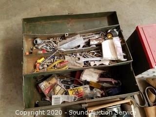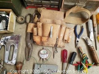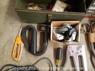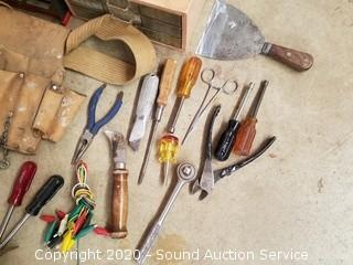 Lot Details: Includes leather tool bag, wrenches, screwdrivers, plumbers snake, casters, old tool box with some tools and more.