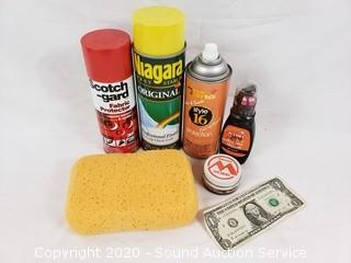 Lot Details: Includes polish, sponge, spray starch, Scotch Guard water repellent, shoe cream, leather and suede protection.