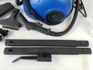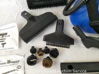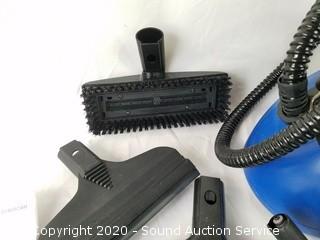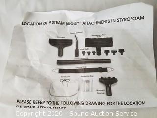 Lot Details: Complete, works. Includes squeegee, steam jet nozzle, upholstery & floor brush, scrub brush, 2 extension wands, carrying strap, terry cover, measuring cup and garment steamer. Comes in original box.
