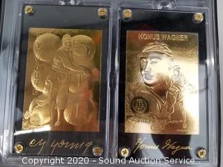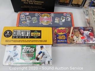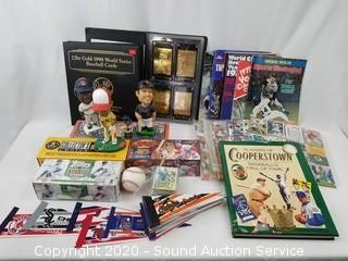 Lot Details: Includes 4 bobble heads (Mike Piazza, Tony Gwynn, P. Martinez and Tiny Champ, one has a loose head), sealed box of 2000 Topps complete set baseball cards, sealed 1992 Upper Deck complete set baseball cards, sealed box of 1994 Upper Deck, sealed 1999 complete set, various misc. football and baseball cards, Heroes of Baseball gold plated cards, baseball literature, mini pennants and Babe Ruth baseball.