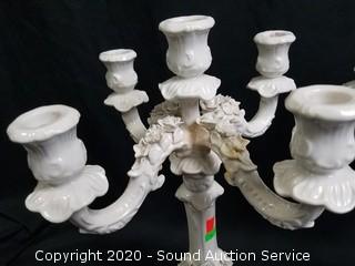 Lot Details: One has 2 candle holders that were broken and repaired. Has a blue crown with a D hallmark with "Original Germany" on the bottom, believe to be made by Karl Heinz Klette c.1950s. High relief floral accents. Do not notice any other damage. 16" T x 12" diameter.