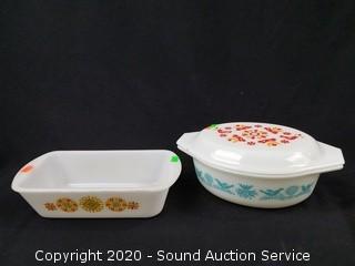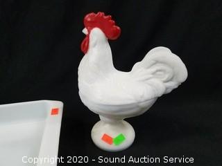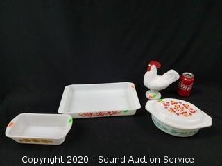 Lot #0174: Vtg. Milk Glass Pyrex Cookware & Rooster-on-Nest