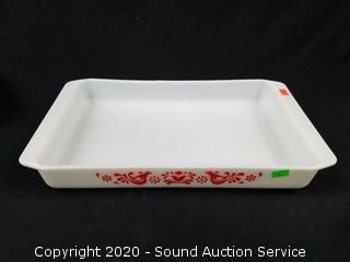 Lot Details: Includes "Bluebird" 1959-1961 roasting pan with "Friendship" 1971-1974 lid 3" x 8" x 6", "Red Rooster Friendship" casserole 2" x 13" x 9", Oven Bake loaf pan and 8.5" rooster on nest.