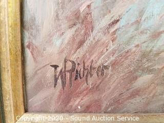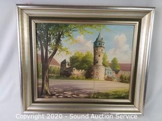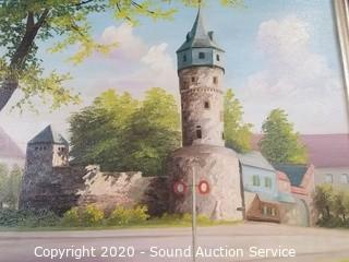 Lot Details: One is signed "S.Muchi" and is the image of Driberger Warte with landscape information on the back dating 1954. 21.5" x 25", some wear to the frame. Other is signed "W.Richter" purchased from an art gallery in Muenchen, looks old, 21" x 27".