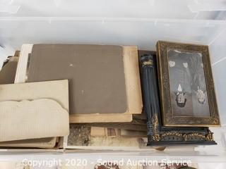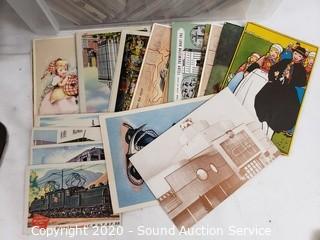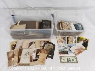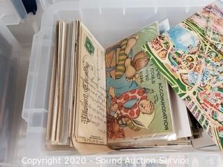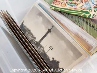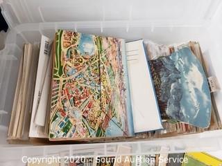 Lot Details: 6.5" x 17.5" x 9" and 4" x 13" x 8" totes with lids included. Post cards appear to be from early to mid 1900s.