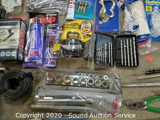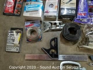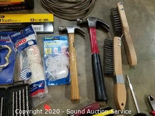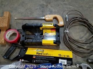 Lot Details: Includes hammers, square, hex keys, drain snake, miter saw with box, pencil sharpener, straight line, Goop, shoe goo, wrenches and more.