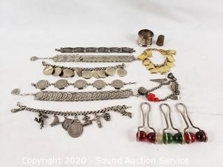 Lot Details: Includes and old thimble with built in thread blade. 8 charm bracelets total. Some of the charms on the bracelets are stone. Also includes buffalo head bracelet and vintage African plants ring.
