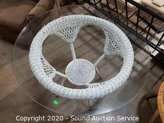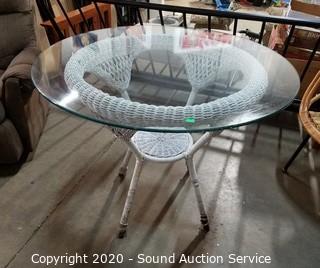 Lot #0053: White Wicker Base Glass Top Round Patio Table