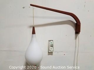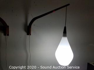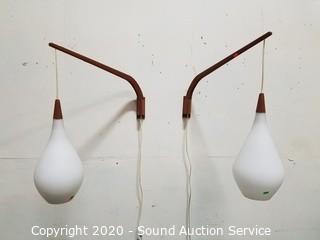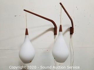 Lot Details: Hanging frosted glass shades, 14" H x 8" Dia. Extends from the wall 23". Both in excellent condition. Plug into any standard outlet with inline switch, both work.
