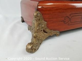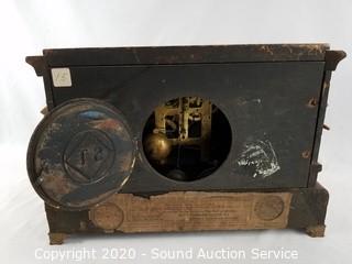 Lot Details: c.Late 1800s, cherry finish. Half hour chime, hourly isn't working. Wants to run but wont stay running, needs cleaned. Hands are a little finicky. One of the pillars is missing a nail. Has a lot of potential. Original directions on the back with a patent date of 1880. 11.5" x 16" x 7".