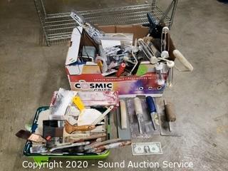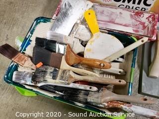Lot Details: Brushes, rollers, caulk gun, grease gun, roller trays & more.