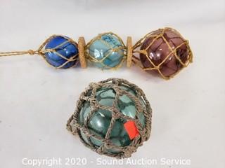 Lot Details: Includes Sascha B. hand painted dish, blue, green and purple fishing floats (2" to 3"), 6" x 7" planter and made in Japan stein.