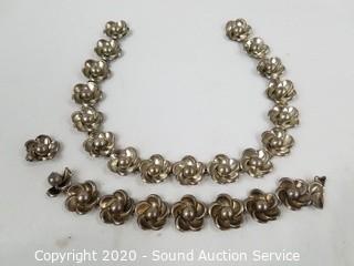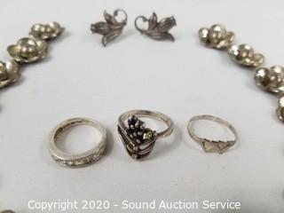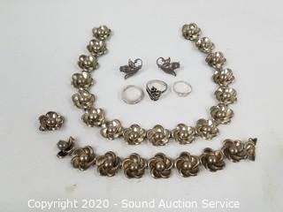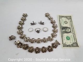 Lot #0040a: Sterling Necklace, Bracelet Set w/Rings & Earrings