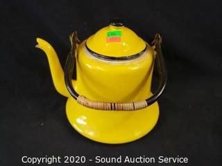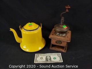 Lot #0086: Vtg. Coffee Mill & Yellow Enamelware Teapot