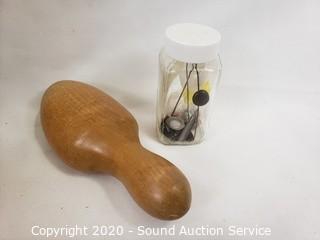 Lot Details: Includes Howard Germany scissors, thimbles, needles, shoe horn and more. Box is 3.5" x 9" x 8".