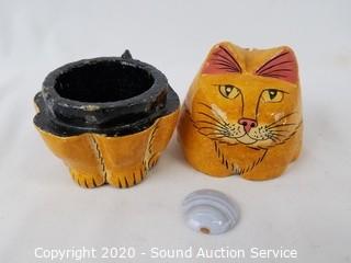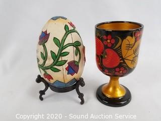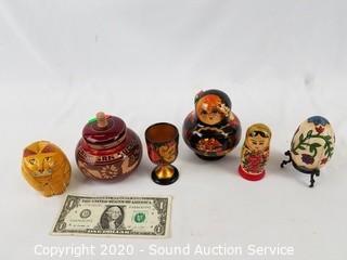 Lot Details: Includes Jim Shore egg with stand, Russian wood cordial, made in India wood cat trinket box, carved wood Cabos San Lucas box and 2 Russian nesting dolls. Largest is 4.5".