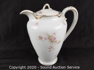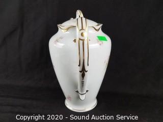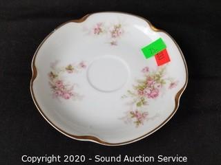 Lot Details: Pink floral print with gold trim. Includes 5 cups, 6 saucers (one has a chip) and pitcher.