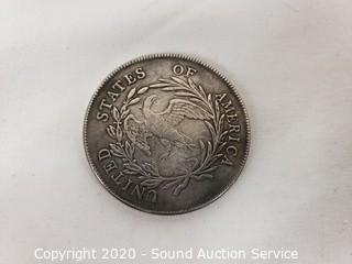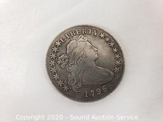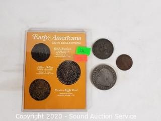 Lot Details: Canadian penny has some dings and dents. Bronze and copper composition. Coin replicas include 1796 draped bust early dollar, gold doubloon of Phillip the Fifth pillar dollar and pirate 8-real.