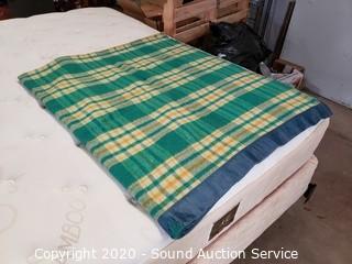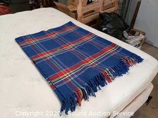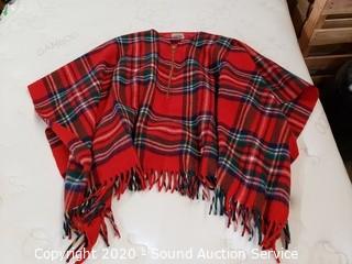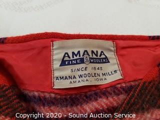 Lot Details: Includes Amana wool red plaid poncho, afghan table runner (60" x 21"), green plaid wool blanket (has a label "Judy M. Schroeder, 84" x 68") and 56" x 72" blue and red plaid wool blanket.