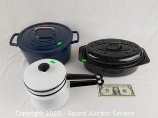 Lot Details: Includes Martha Stewart 8qt cast iron dutch oven, 12" roaster and double boiler pot.