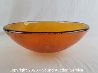 Lot Details: 6.5" x 16.5" diameter. Amber tempered glass with engraved design. Looks new, no issues.