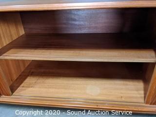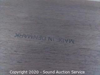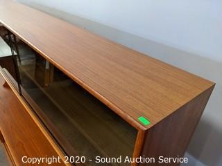 Lot Details: Made in Denmark. In excellent condition, has a couple very minor scuffs on the legs and edges, almost unnoticeable. Top display has smokey glass doors, shelves are fixed. Bottom has 4 sliding doors that open and close individually, all move smoothly. Has a single adjustable shelf. Both bottom and top shelves have some minor wear spots. 2 piece for easy travel. Overall 57.5" T x 77" W x 17" D.