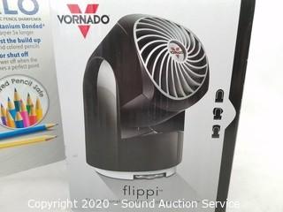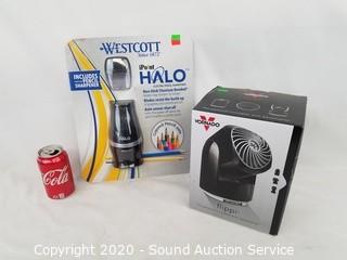 Lot Details: Fan is a Vornado Flippi, pencil sharpener is a Westcott iPoint Halo (comes with manual pencil sharpener).