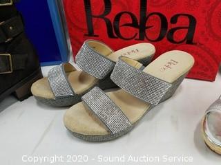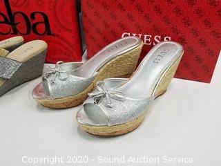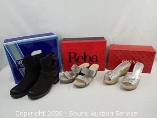 Lot Details: Size 6 to 6.5. All in excellent condition. White Mt. Brown suede boots, S:6.5, Reba platform sandals S:6.5, Guess platform sandals S:6.