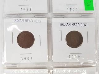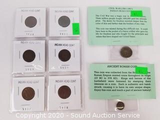 Lot Details: Includes Civil War 1863 Indian Head cent, 1880-1908 Indian Head cents and Ancient Roman coin (hard to make out).