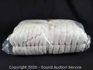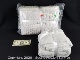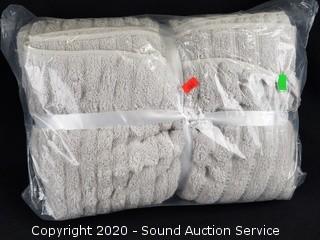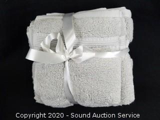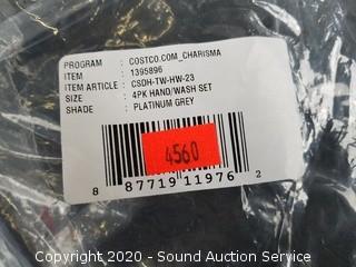 Lot Details: 2 hand towels, 2 wash cloths, 2 bath towels. All similar in color, hand towels and wash cloths are platinum gray color, bath towels are chrome color.