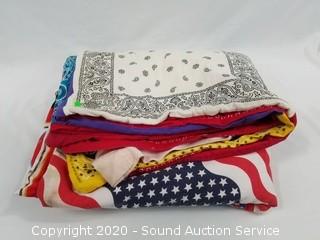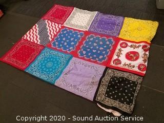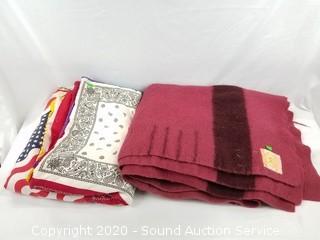 Lot Details: The Hudson Bay has a 5" hole in the center, 64" x 84". The quilt is handcrafted in America out of handkerchiefs, stitching has come free about 1'ft along the edge, otherwise good condition, 56" x 72".