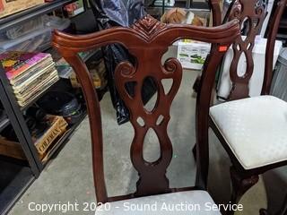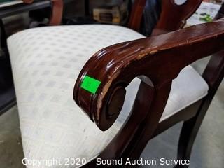 Lot Details: In excellent condition, a few minor scuffs on the top of the table and on the leaves. Comes with 2 captains chairs, pierced splat back with white upholstered seat cushions. Cabriole legs on both chairs and table. 30.5" T x 60" x 44" table. Comes with (2) 20" leaves.