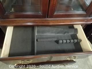 Lot Details: Mirrored back, glass shelves, beveled glass in the doors, felt lined top drawer. In excellent condition. Minor scratch in wood. 81" H x 62" W x 19" D. 2 piece for easy travel.
