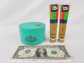 Lot Details: Includes 2 RoC 1.1oz anti-wrinkle creams and 3.4oz Boscia jumbo cactus water moisturizer. Boscia is sealed, RoC creams are full or mostly full.