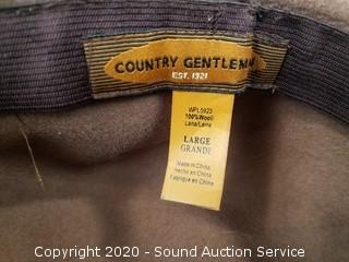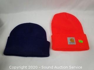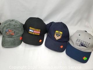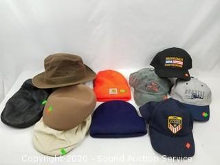 Lot Details: Includes Stetson newsboy cap size XL, 4 NRA and Seattle caps, orange Carhartt and blue beanies, Gap newsboy cap, Gentleman's Country wool newsboy and brown brimmed hat size L.