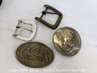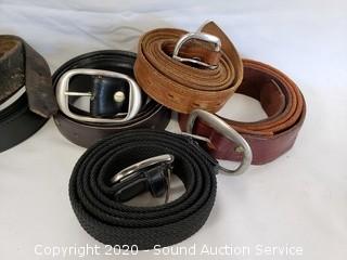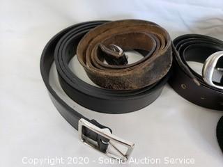 Lot Details: One of the belts is woven fabric, the rest are leather. Includes limited 1979 buffalo nickel replica belt buckle serial 335 and 3 other replacement buckles. 48" to 60" long belts.