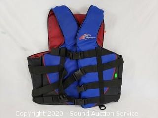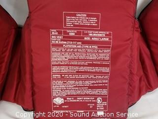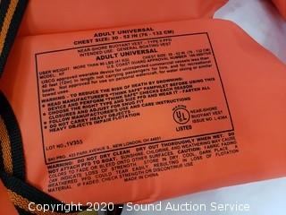 Lot Details: One is a Stearns adult large 44" to 46" chest, others are adult universal life jackets 30" - 56" chest, fins are size small, adjustable.