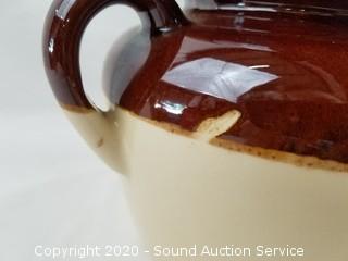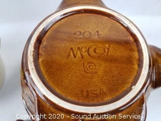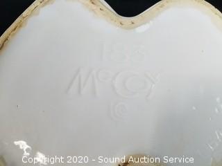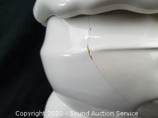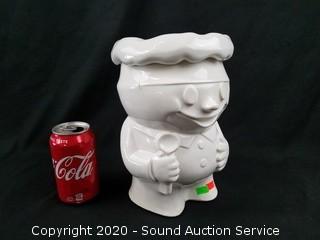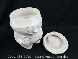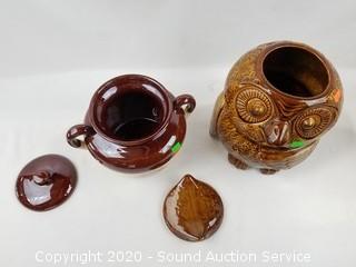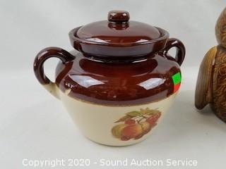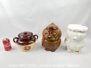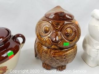 Lot Details: Includes pottery owl cookie jar (10" x 7.5", in excellent condition), McCoy chef cookie jar (has a crack) and peach and cherry print (7" x 9.5" x 7.5").