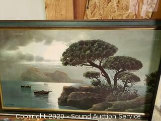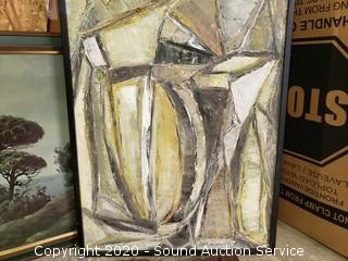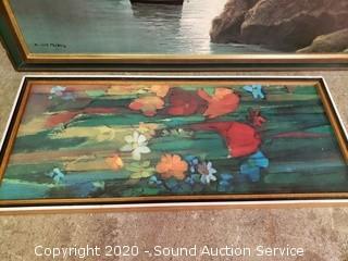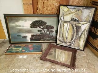 Lot Details: Includes seascape print 53" x 29", abstract floral 13" x 30", original abstract oil on canvas 26" x 37" and 22" x 26" mirror.