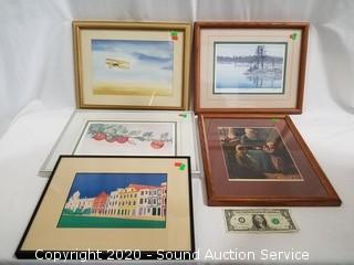 Lot Details: 3 are signed. Includes Robert McLain "Evening Reflections" 91/500 litho (12" x 15") and "Apples" 25/500 litho (12" x 16"), Dwight Hammond original watercolor? (12" x 15.5"), Tetis Avista o Mastero dos Jeronimas architectural print (13.5" x 10.5") and 1939 B.Pothast reproduction by Mead Johnson (12" x 15").