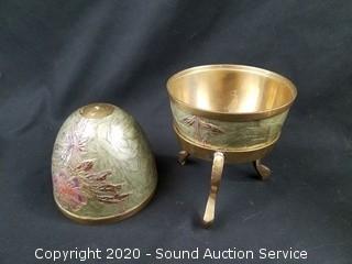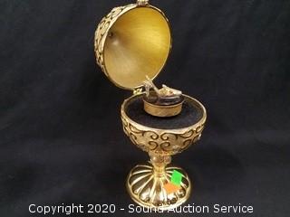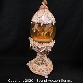 Lot Details: Includes Faberg? style musical egg carousel, 2 hand blown crystal and etched glass eggs made in Egypt, Faberg? style trinket box and brass egg with stand. Smallest is 3" x 1-3/4", largest is 11" x 4".