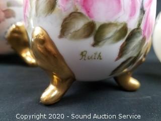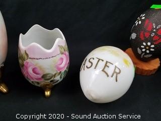 Lot Details: 2 are large ostrich eggs, one hand painted egg is cracked, do not see a signature. Also includes Satsuma hand painted egg, glass Easter egg, Lea McGenty #12/56 and one signed "Ruth". 4.5" to 8.5" tall.